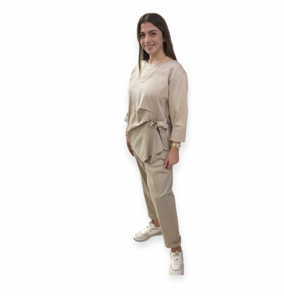Σετ ασύμμετρη μπλούζα με φιόγκο και παντελόνι baggy Beige