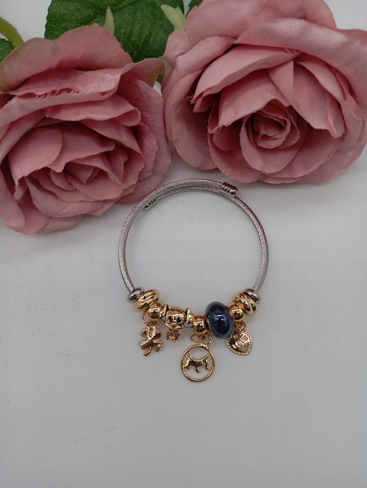 Βραχιόλι Stainless Steel Charms τριφύλλι, σκυλάκι, καρδούλα και μπλε χάντρα.