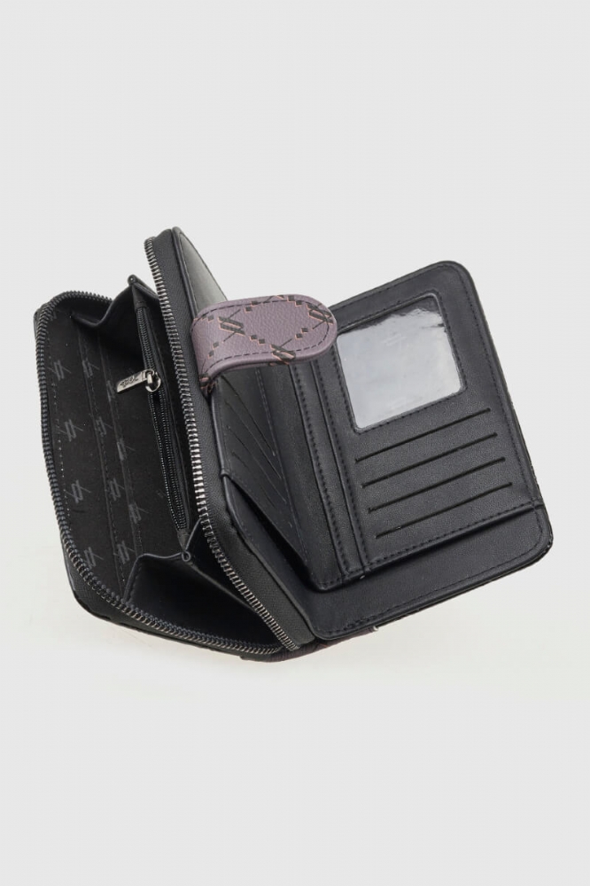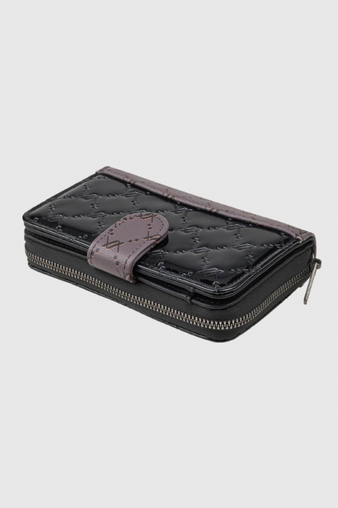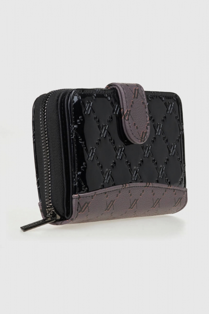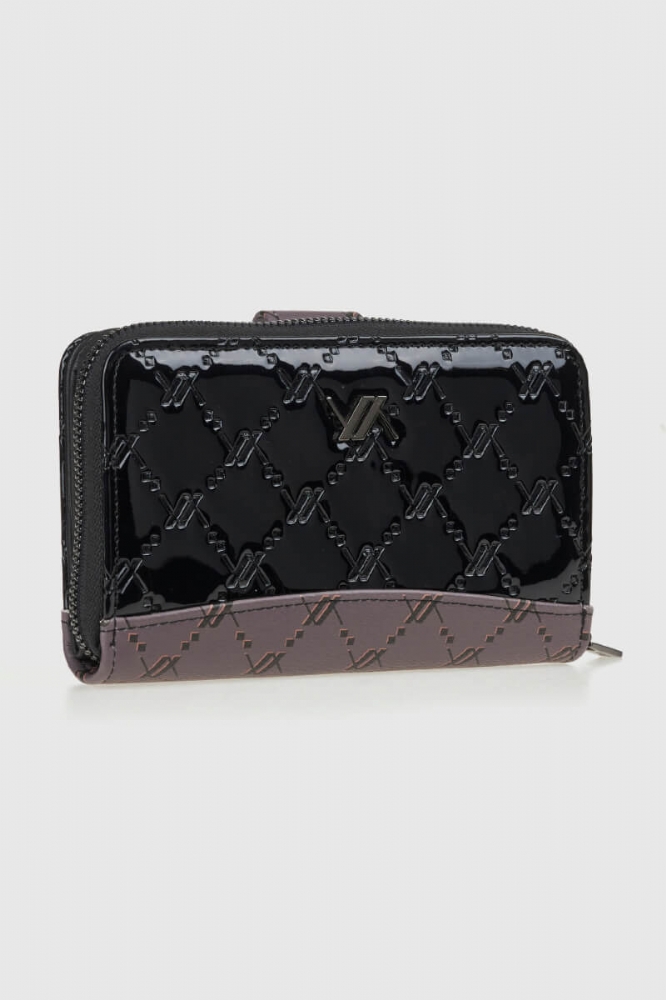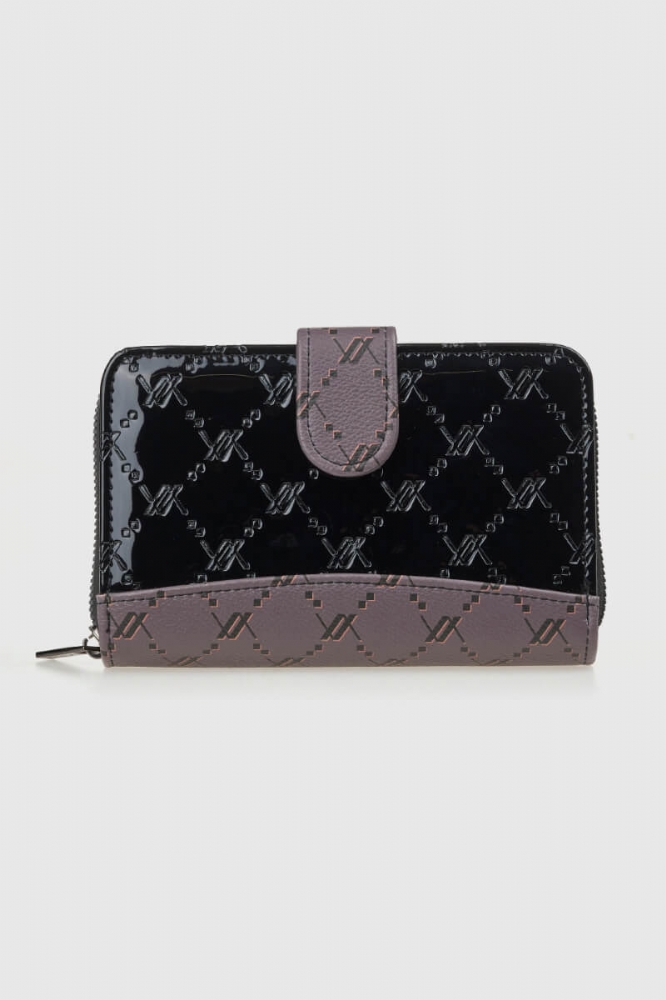 Γυναικείο πορτοφόλι σε διχρωμία μαύρου και μωβ, με γυαλιστερή επιφάνεια και ανάγλυφο μοτίβο.