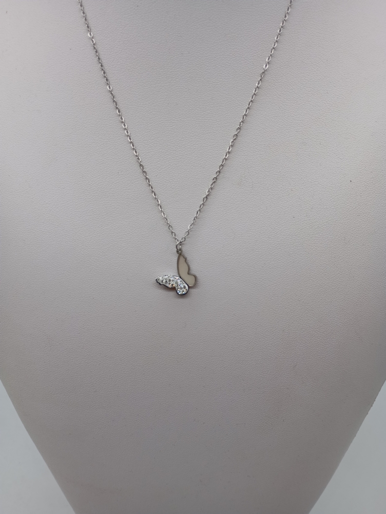 Κολιέ ατσάλινο ασημί Πεταλούδα με στρασάκια στο ένα φτερό 0523 Silver