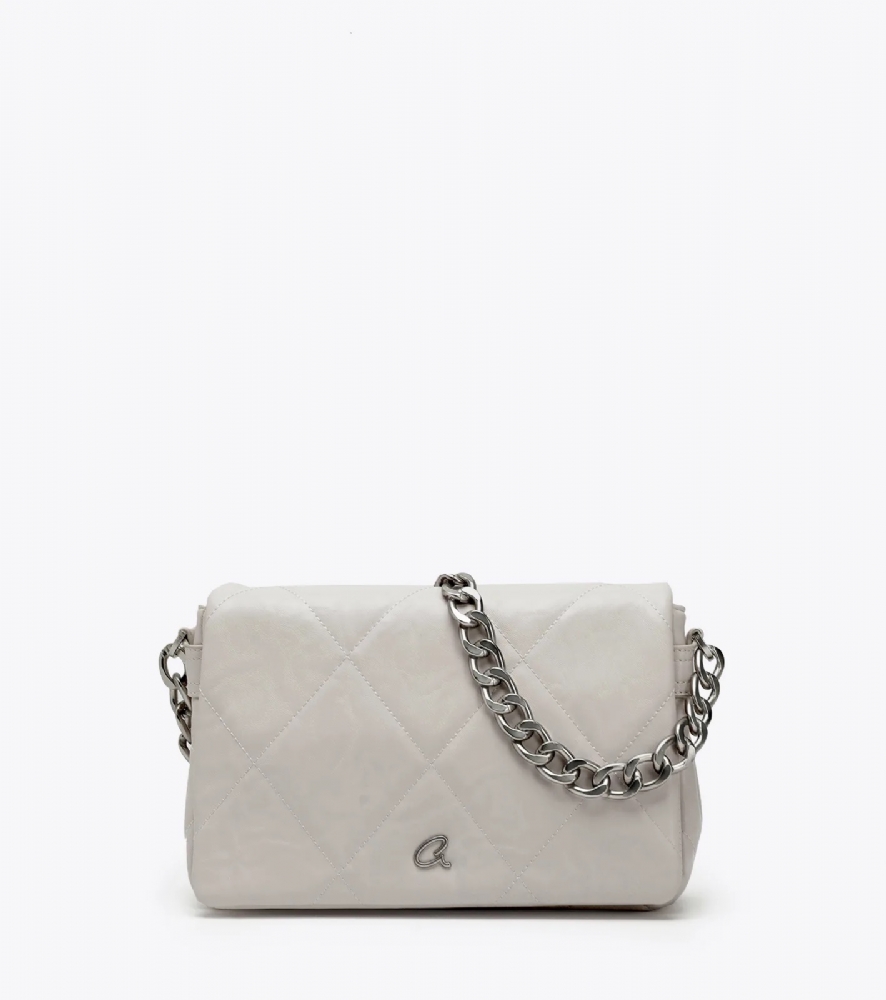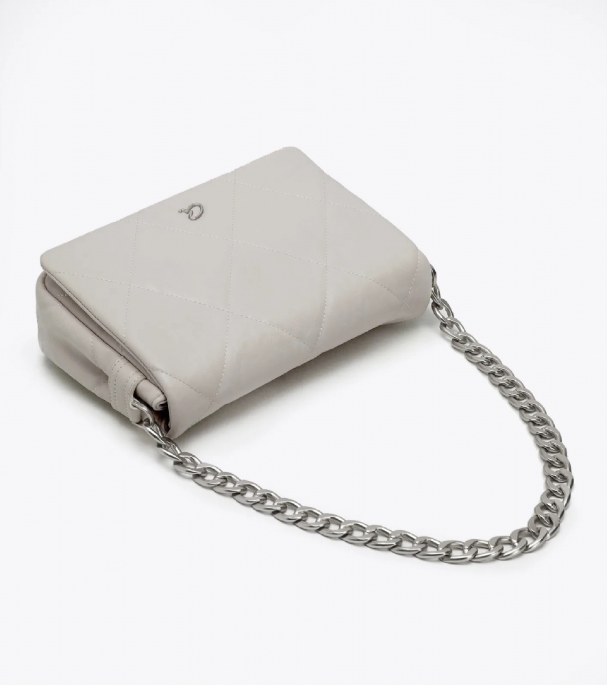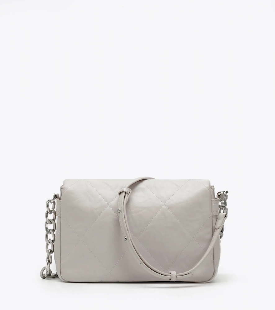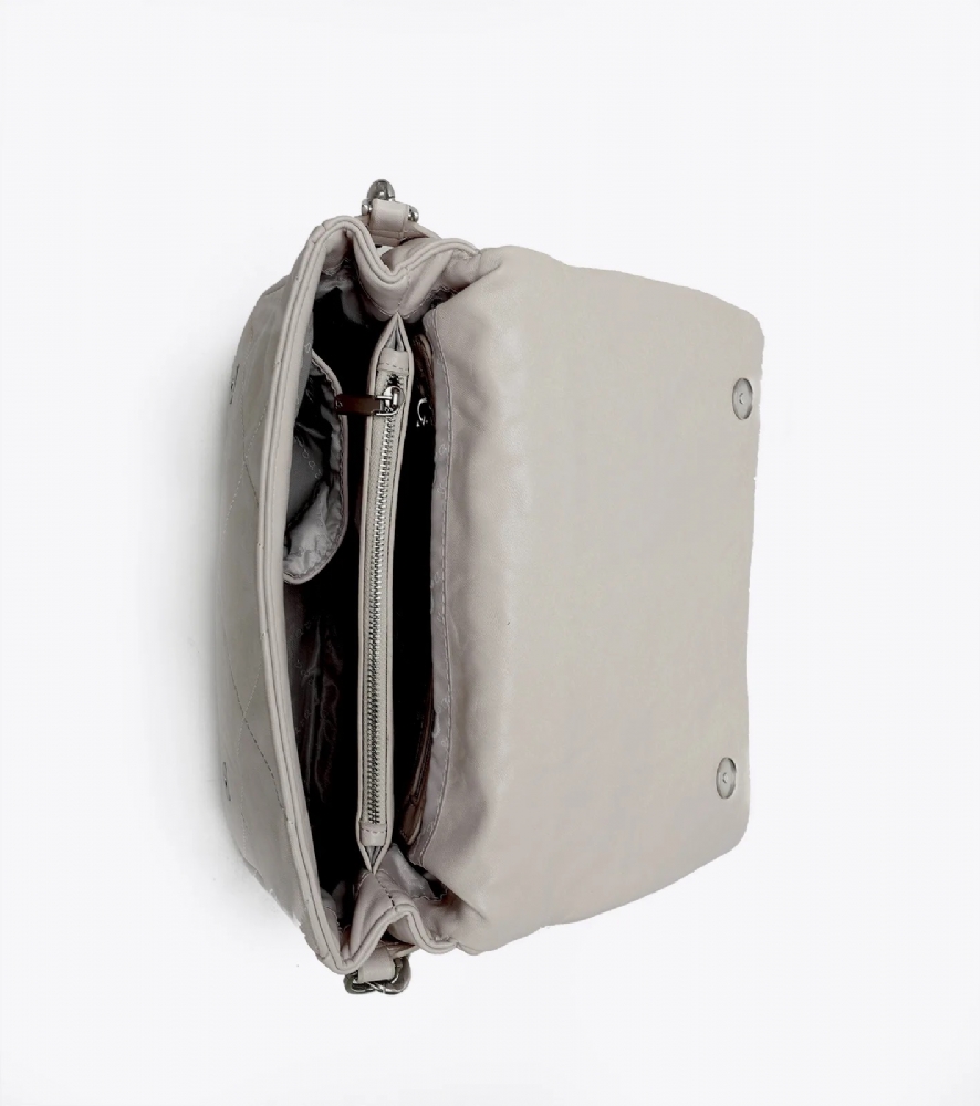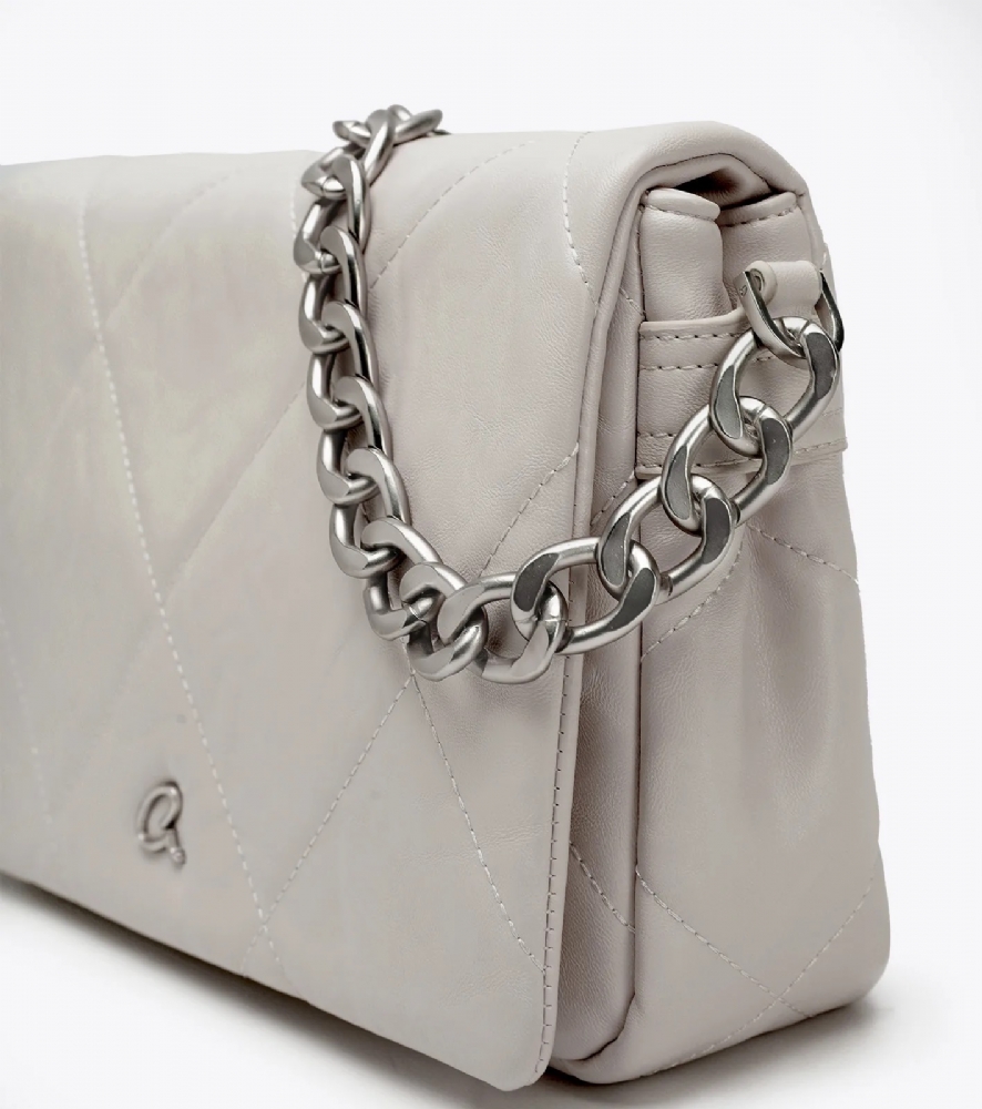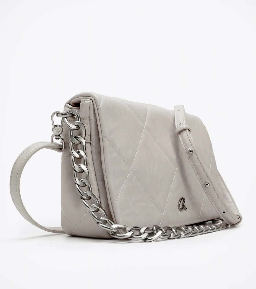 Με σχέδιο από γαζιά τύπου καπιτονέ και μεταλλικές ματ λεπτομέρειες σε ασημένιο χρώμα.