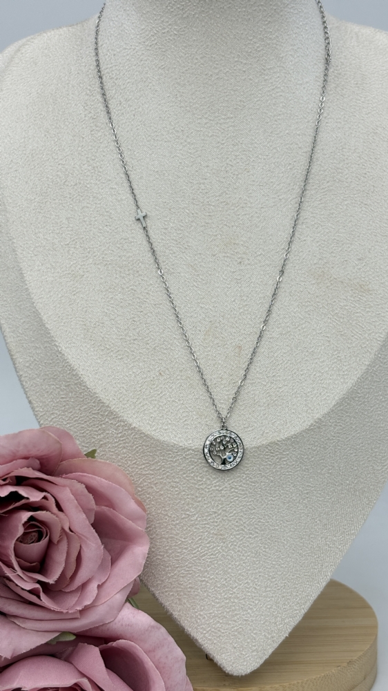 Κολιέ ατσάλινο δέντρο της ζωής με μάτακι και στρας 1223 Silver : 1