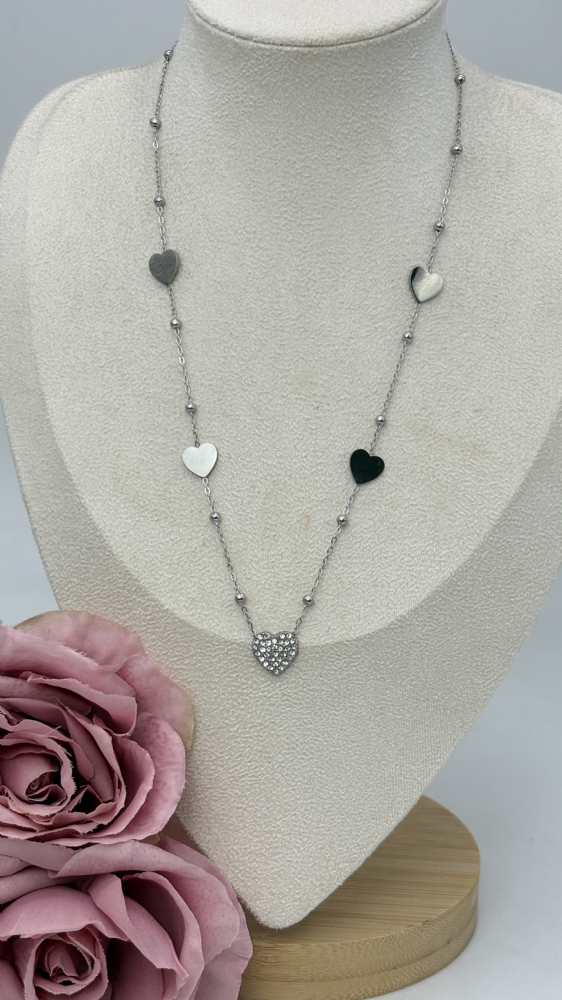 Κολιέ ατσάλινο με καρδούλες και στρας 1257 Silver : 1