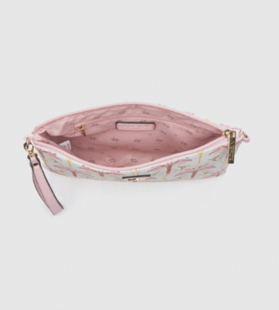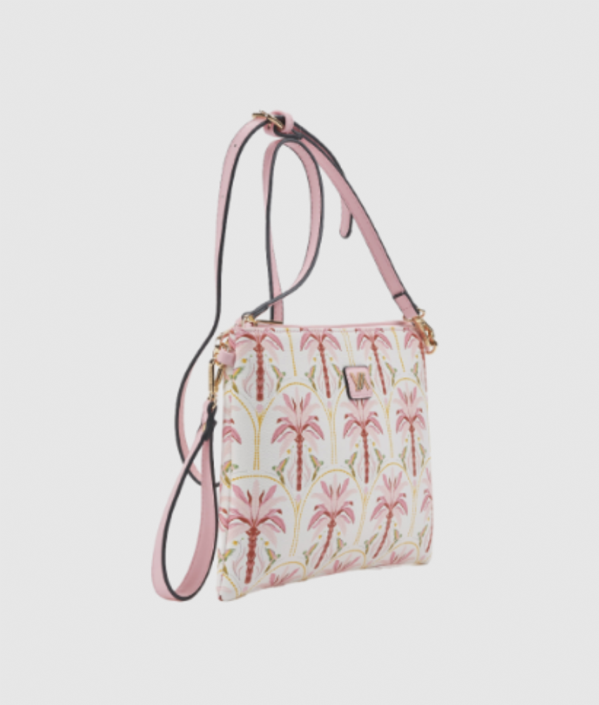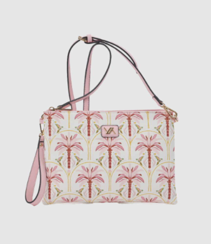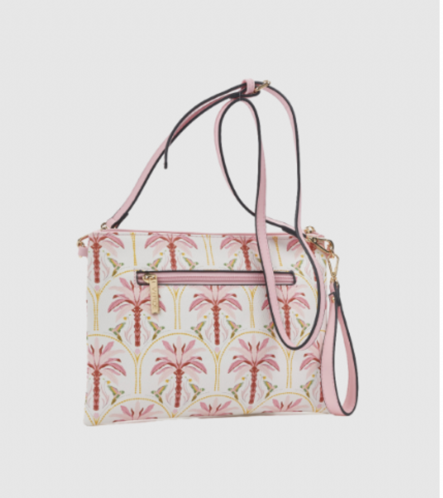 Κομψή τσάντα ώμου με ρομαντικό τροπικό μοτίβο που ξεχωρίζει, διακοσμημένο με φοίνικες και διακριτικές λεπτομέρειες σε παστέλ αποχρώσεις.