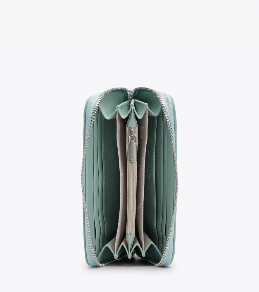 Εσωτερικά περιέχει πολλαπλές θήκες για κάρτες και χαρτονομίσματα και κεντρική θήκη με φερμουάρ.