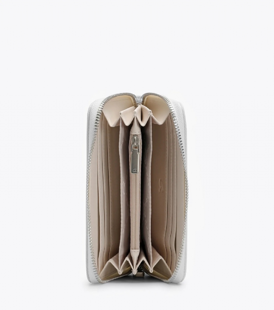 Εσωτερικά περιέχει πολλαπλές θήκες για κάρτες και χαρτονομίσματα και κεντρική θήκη με φερμουάρ.