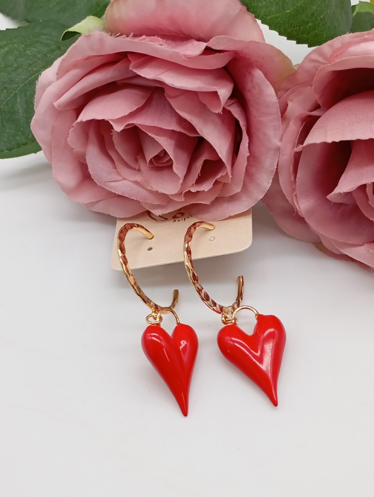 Σκουλαρίκια χρυσοί κρίκοι με καρδούλες κόκκινες γυαλιστερές 52808 red