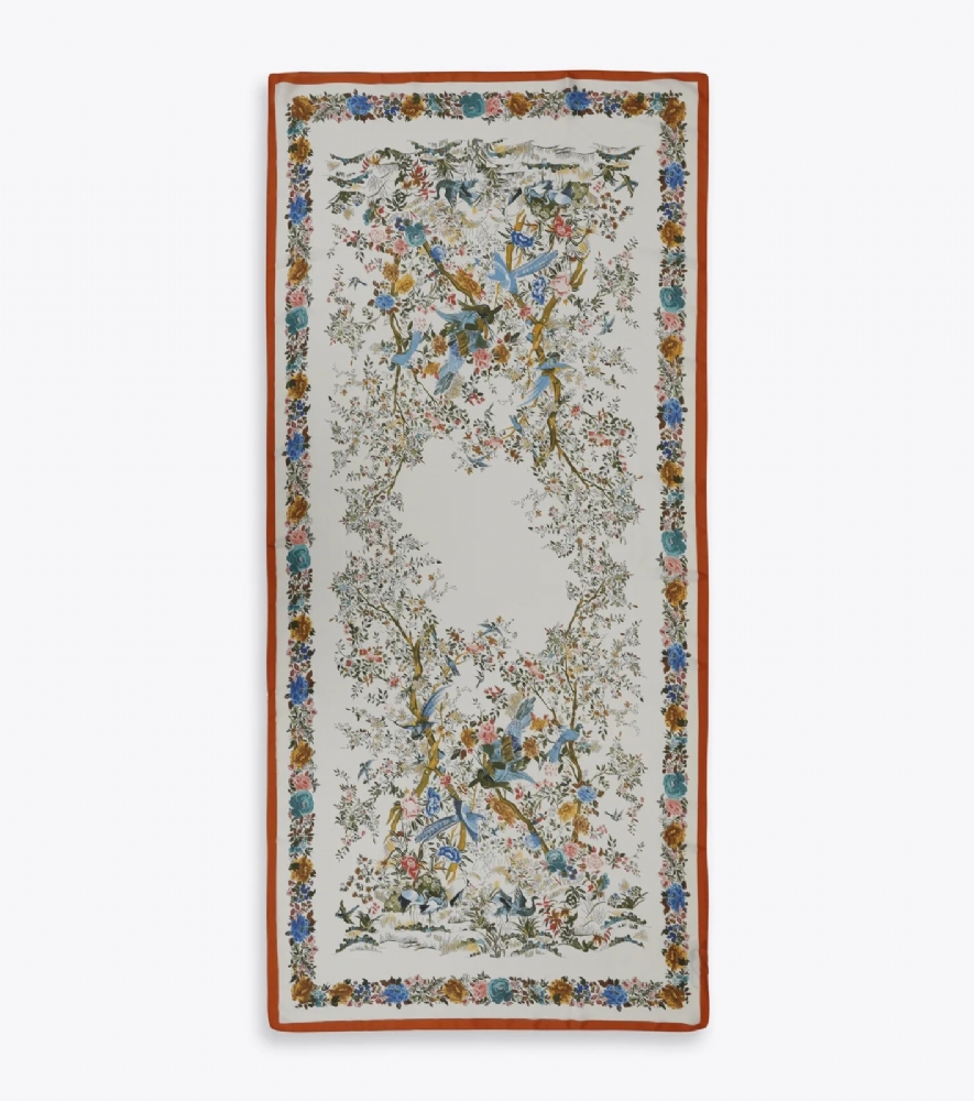 Γυναικείο φουλάρι με περίγραμμα και σχέδιο με κήπο και πουλιά.